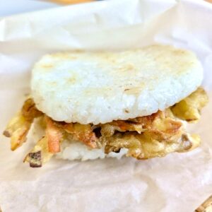鶏肉と自家製黒豆・旬の野菜をたっぷり使ったかき揚げを、ライスバンズにはさみました。地元のレモンを使った塩レモンだれでさっぱりとしたライスバーガーです。
